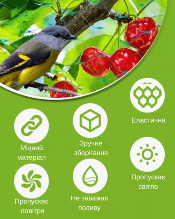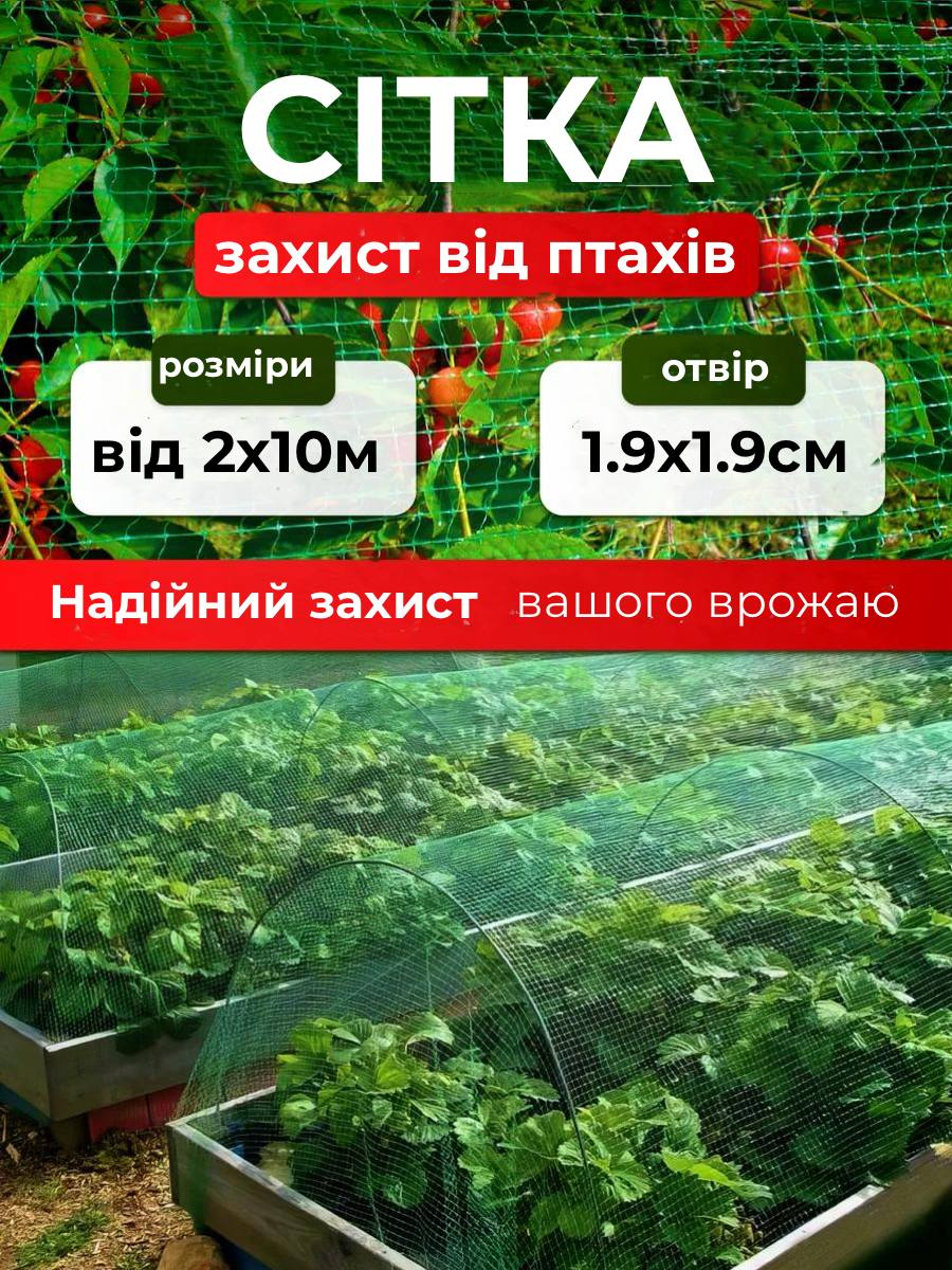 Наша міцна сітка з дрібними отворами 19х19 мм надійно захищає дерева, кущі та грядки від птахів та зберігає 99% врожаю цілим та неушкодженим